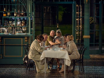 Ģirts Ķesteris (Helge), Indra Briķe (Else, viņa sieva), Artūrs Skrastiņš (Kristians, Helges dēls), Rēzija Kalniņa (Helēne, Helges meita), Lauris Dzelzītis (Mikaēls, Helges dēls), Ilze Ķuzule-Skrastiņa (Mette, Mikaēla sieva), Kristīne Nevarauska (Pija, oficiante), Aminata Grieta Diarra (Umaima Gbatokai), Dainis Gaidelis (Helmuts, vakara vadītājs), Artis Robežnieks (Kims, šefpavārs), Lauris Subatnieks (Larss), Āris Rozentāls (Vectēvs), Lidija Pupure (Vecāmāte), Juris Bartkevičs (Leifs, Helges biznesa partneris), Ieva Florence (Leifa sieva), Mārtiņš Upenieks (Pouls, Leifa dēls), Lelde Dreimane (Mišela, oficiante), Edijs Zalaks (Bents, Helges biznesa partneris), Rūta Hasnere, Annika Auziņa, Raivis Mediss (Oficianti)